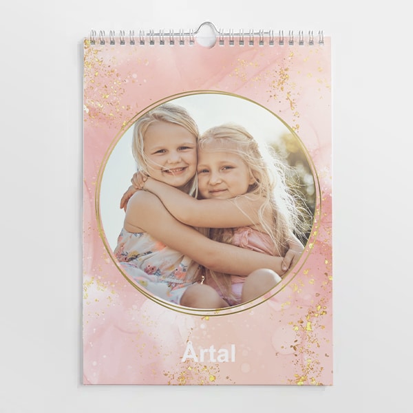 Fotoalmanacka 2026 i storlek A4 210x297 mm. Kalender med tema guldigt och glitter. 13 blad, framsida samt 12 månadsblad. Praktisk upphägningskrok i mitten. Skyddande frostad framsida. Skapa direkt online eller ladda ner vårt program för ännu mer redigeringsmöjligheter