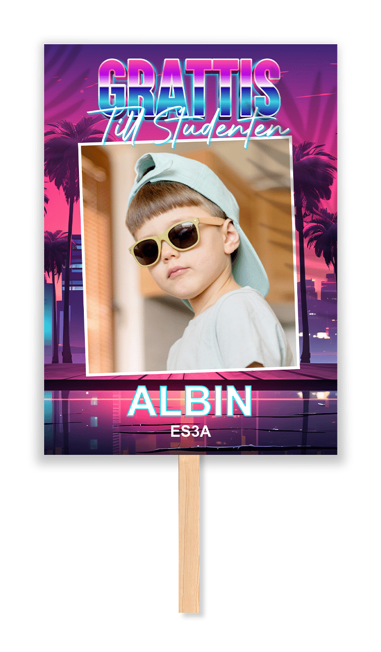 Studentskylt med skön sommar vibe. Stor text för namn samt mindre text under med klass.