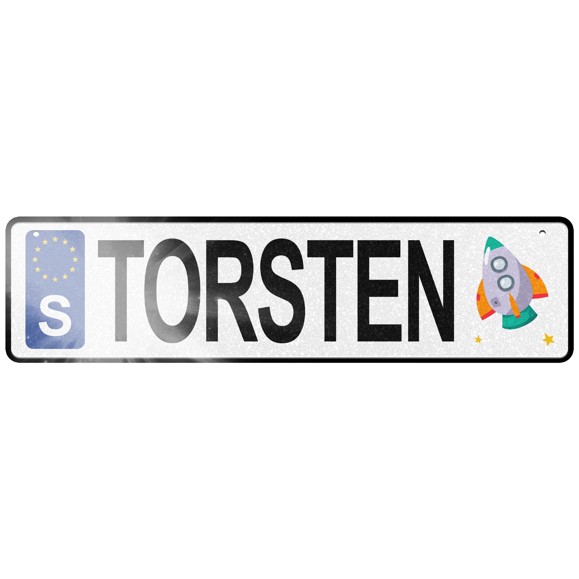 Personlig barnvagnsskylt med plats för barnets namn, dekorerad med häftig rymdraket.