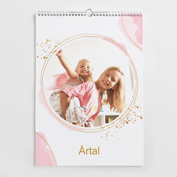 Fotoalmanacka 2026 i storlek A3, 297x420 mm. Framsida med rosa och guldigt tema som passar perfekt som årskalender samt 12 månadsblad. Hängs i överkant. Här får du en stor framsida att placera foto på. Skapa direkt online eller ladda ner vårt program för ännu mer redigeringsmöjligheter.